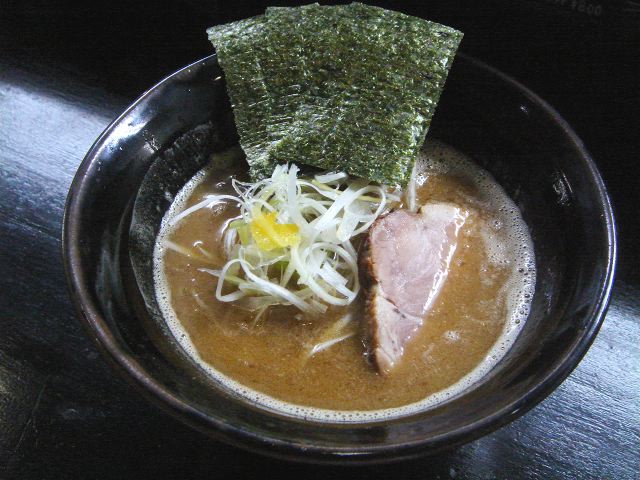 店内の券売機でらーめん(130g)の食券を買い、カウンターでしばし待つ。お店で使っている丼やグラスはおじさんの手作りということだ。深い丼で出てきたラーメンは、茶濁スープから魚介系の香りがしてくる。豚骨魚介系のスープは濃厚で美味しい。麺は細縮れ。具は、チャーシュー(厚)・メンマ・のり・エシャロット?。そしてゆず。柑橘系の香りのさっぱり感で後味もなかなかのもの。(2010/11)