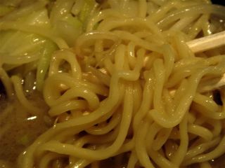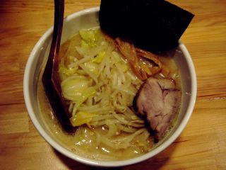 小ぶりの丼で出てきたラーメンは、スープは、柔らかでまろやかな「越中味噌」、古式製法を受け継いだ「会津味噌」、癖のない良質な「信州味噌」、裏ごししたきめ細やかな甘口の「瀬戸内・広島味噌」の合わせ味噌を使っていると書いてある。白いスープは甘めに感じるが、コクが深く、なかなか美味しい。麺は太縮れで若干柔らかめ。具は、チャーシュー(ロース)・のり・野菜炒め(もやし・タマネギ・キャベツ)・メンマ。途中から一味を投入して味の変化を楽しんだ。(2009/3/4)