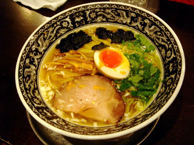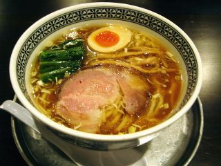 小さなお盆の上に乗って出てきたラーメンのスープは鶏ガラと魚介系のダシと思われコクがある。ほどよい油が食欲を増す。麺は平打でとても肌理が細かく、喉ごしがよい。具は、炙りチャーシュー・ほうれん草・メンマ・味玉子(1/2)・ネギ。チャーシューは、炙ることにより香ばしくなるし、スープの温度も下げないという気配りである。(2008/11/8)
