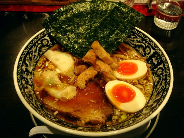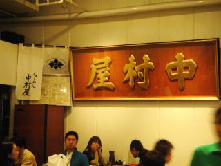 妻と二人で、吉永小百合と笑福亭鶴瓶と蒼井優などの出演と山田洋次監督の話題の映画「おとうと」を見たあとに寄る。店内10人ほどの待ち客があり、15分ほどしてカウンター席に座ることができた。待っている間にメニューが回ってきて、バイトの女の子に促され、前もって食券を買うことになる。メニューは、だしかけ(トッピングはネギのみのシンプルな逸品)(塩・醤油)600、らーめん(あぶり焼豚、半あじ玉、メンマ、青葉)(塩・醤油)780、上中村屋(あぶり焼豚、コロ焼豚、半あじ玉、メンマ、青葉)(塩・醤油)980、特中村屋(あぶり焼豚、コロ焼豚、あじ玉、自家製ワンタン、メンマ、青葉、海苔5枚)(塩・醤油)1,280、あじ玉らーめん(あぶり焼豚、あじ玉、海苔2枚、メンマ、青葉)(塩・醤油)880、柚子塩らーめん(あぶり焼豚、半あじ玉、メンマ、みつ葉、柚子、刻み海苔)880、大盛+100、真空平打ち麺+50など。私は特中村屋の醤油を、妻は柚子塩らーめんを、それぞれ真空平打ち麺で注文した。