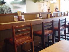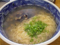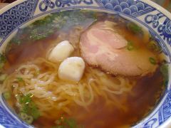 コメント:店内は割烹風で趣がある。カウンター席には一人用の平たい盆が置いてあり、その上に料理が出される。ラーメン以外のメニューも豊富である。「津軽下北半島(いったいどっちなのだ!)・脇の沢漁港産の最上の焼き干しをベース」にして、「醤油は国産大豆のみを使った二年仕込み」のものを使用。確かに焼き干しが十分に生かされていたスープであったが、薬膳のようにも感じた。好みの分かれるところであろう。太やや縮れ麺は加水率が高いのか、つるつるとした食感である。具は、チャーシュー(1)・ハモのすりみ団子・ネギと非常にシンプル。落ちついた店内はゆっくりとお酒を酌み交わしたくなるようだった。
