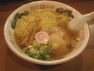 出てきたラーメンは透明感のあるスープでビジュアルが美しい。スープは、あっさりした塩味だが、油は意外に多めである。麺は太縮れ麺で柔らかく茹でてあり、高齢者向き(?)かも知れない。具は、海老ワンタン(5)・チャーシュー(モモ2)・なると・メンマ・ネギ。(2009/10/12)