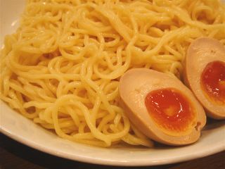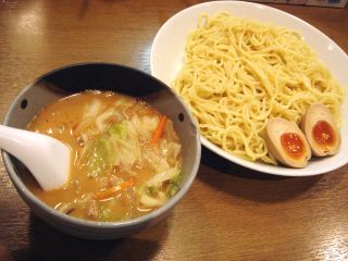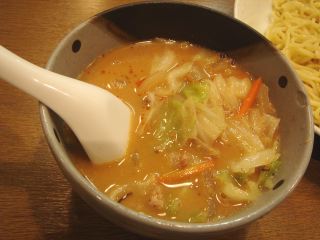 「大盛(1.5玉)無料」の掲示につられ、食券を渡す時に「大盛で」と声をかける。つけ汁はピリッと辛味の利いた濃厚な味噌味。もやし・キャベツ・ニンジン・挽肉炒めとサイの目切りチャーシューが入っている。麺は太縮れで濃厚なつけ汁に負けていない。麺には味玉子が添えられている。スープ割りをお願いすると、小さな丼にやや白濁したスープを持ってきてくれた。「お好みでどうぞ」というわけである。なかなか満足の一杯である。(2008/10/6)