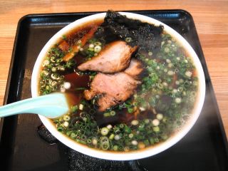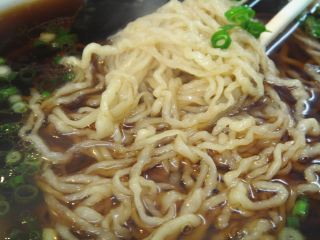 すぐに出てきたラーメンは、スープが丼にこぼれんばかりに注がれており、こぼれてもいいようにお盆に乗って出て来る。カウンターの上におかれたお盆を自分の手前に移動させる時に、注意をしたがやはりこぼれた。お盆は絶対に必要である。さて、スープは濃いめの醤油色。和風のダシなので、それほどこってりしてなくてコクがある。麺は、細平打ち縮れ麺で、ピロピロしていてスープがよく絡む。柔らかめだが、これもまた美味しい。具は、チャーシュー・メンマ・のり・ネギ。後片づけは、所定の場所に丼を返すところもセルフである。(2007.5.28)