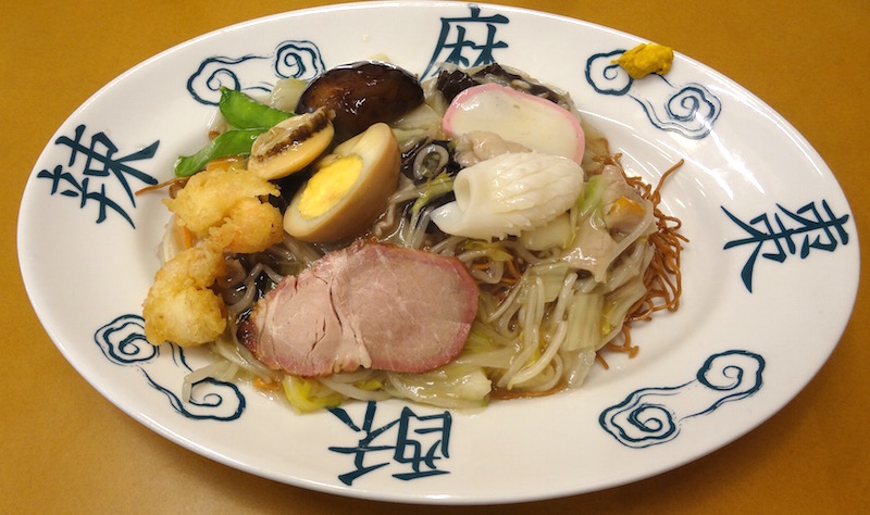 細めの揚げ焼きそばにあんかけがかかり具がたくさん乗っている。味玉、チャーシュー、かまぼこ、イカ、しいたけ、小エビフライ、などなど多彩である。(2020/1)