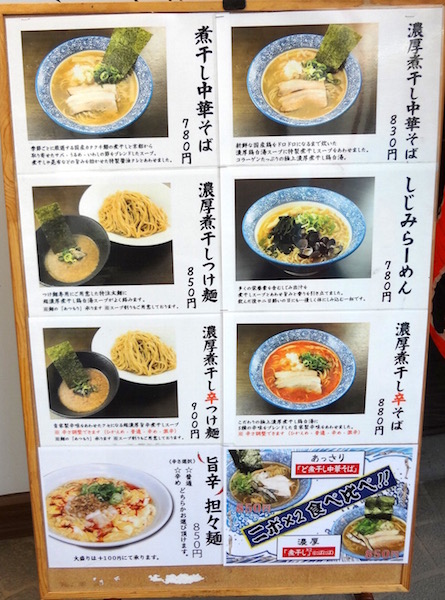ビナウォークのらーめん処の一店。大山街道歩きの途中に寄る。メニューは、煮干し中華そば780、濃厚煮干し中華そば830、濃厚煮干しつけ麺850、しじみらーめん780など。煮干しらーめんが売りなのかな。帰宅後にネットで調べると本店は高円寺だそうだ。店内の券売機で濃厚煮干し中華そばの食券を買うとすぐにカウンター席に案内された。