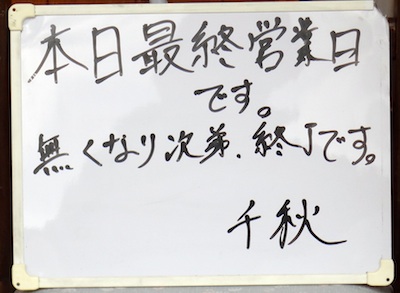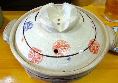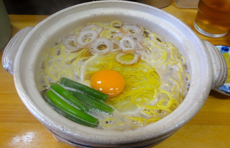 席についてすぐにタクワンの細切りが出てきた。ボリボリかじりながらしばし待つ。しばらくして出てきた鍋焼きラーメンは生玉子を落とした直後のようだ。あっさりした鶏ガラスープに、しっかりとした麺がやや硬めの食感となり、これが合う。寒い時期だったので、これで身体も温かくなった。ところで、私が入店する直前に6人ほどの団体さんが入店したのだが、店主が気をきかせて私の鍋焼きラーメンを先にだしてくれた。そういう気持ちがかなりうれしい。(2013/12)