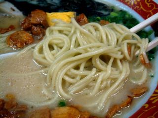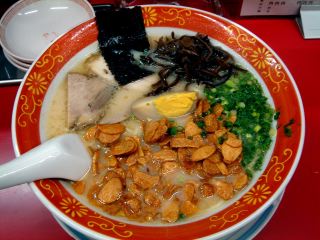 出てきたラーメンは、スープは白濁したものにニンニクチップがちりばめられている。やや雑味がありながらもコクのある美味しい白湯スープである。麺は中細ストレートで低加水。具は、チャーシュー・キクラゲ・のり・味玉子(1/4)・ネギ。(2006. 11.18)