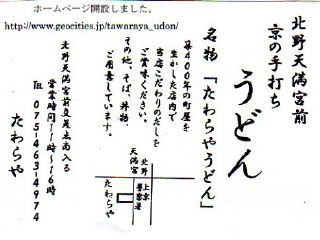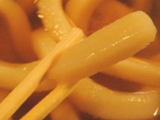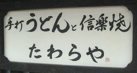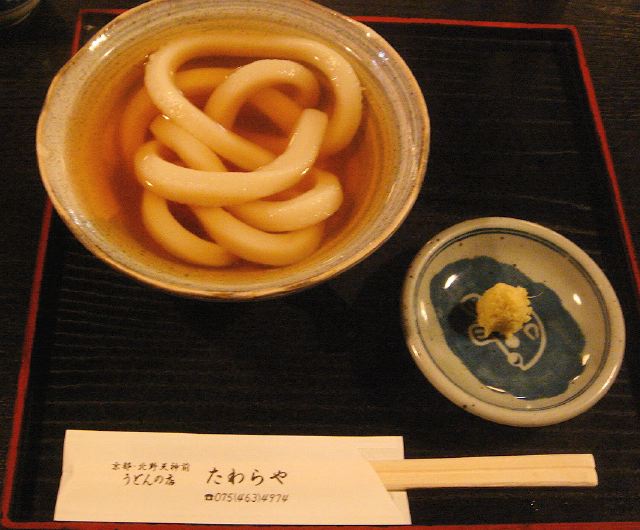 テレビなどで有名な老舗うどん屋さんです。開店の15分前に到着しました。開店と同時に入店しましたが、次から次へとお客さんが入ってきます。パンクっぽい若者から修学旅行の学生、そして高齢者のご一行まで、本当に老若男女が入ってきます。しばらくしてでてきた名物たわらやうどんは、予想通りの超!極太さ。割りばしの3倍くらいの太さがあります。これがわずか2本だけです。ダシにはショウガを溶くことを勧められます。キリッとしたショウガテイストがうどんにからまり何とも言えない歴史を味わうことになります。(2011/4)