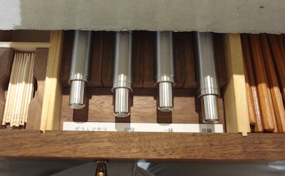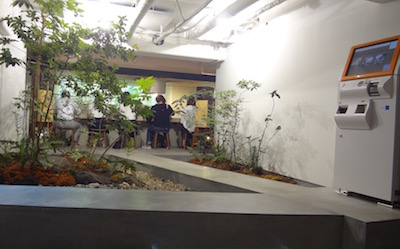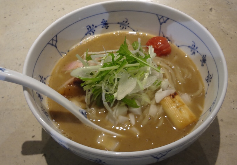 濃厚魚介スープに、コシのあるモチモチ麺。具にはプチトマトや角切りチャーシューなど。カウンターの下にある引き出しに、箸や調味料が入っているしかけである。(2016/5)