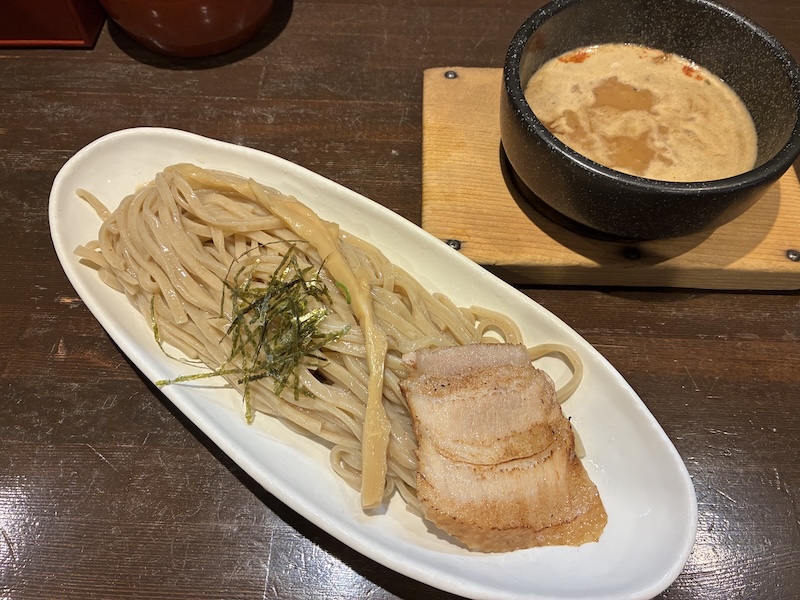 名古屋に本店があり三重県ではこのお店だけらしい。アジア系の男女で営業している。極太平打ち麺で食べ応えがある。豚骨のつけ汁に酢を投入して味変。チャーシュー、穂先メンマ、のり。(2025/6)