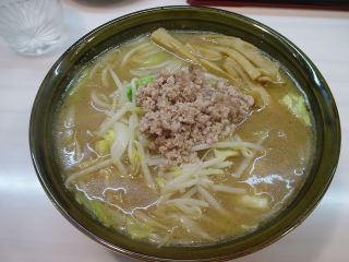ほどなく出てきたみそらーめんは、スープはマイルドなみそ味で野菜の旨みが凝縮されている。麺は中太の縮れ麺。コシはあるが一部がダマになっていたのは残念。そんなに混んでいなかったのに。具は、メンマ・ひき肉・野菜炒め(もやし・キャベツ・玉ネギ)。(2005.2.18)