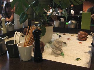 券売機でらーめん黒と生ビールの食券を買い、大テーブルの一角に座った。店内はやや暗めで、らーめん店にはどうみても見えない。こういうところも“渡なべスタイル”なのであろう。大テーブルの中央は、くぼんでいて、白い小さな石が敷き詰められてあり、カエルの置物がいくつか並んでいる。カエルというのがこのお店のコンセプトであろうか。数多くの観葉植物も飾られている。「らーめんをすぐにお作りしていいでしょうか?」と尋ねてくる。生ビールも頼んだのでその確認だろう。細かいところに気配りがある。らーめんにはニンニクをトッピングするかどうかも聞いてきたので、ニンニクを入れてもらうことにした。壁にかかった薄型の液晶ディスプレイでは音楽関係の映画が放映されている。