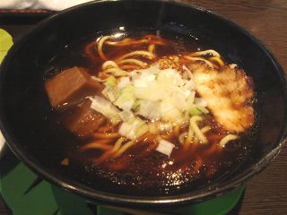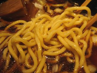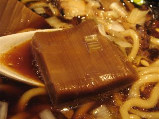 生ビールを口にして、やっと少し暑さが薄れてきた。そして、緑色の厚みのある蓮の葉を模ったゴム製のランチョンマットの上にラーメンが運ばれてきた。「紙エプロンを使われますか?」と尋ねてくる。女性にとってはありがたい申し出だろう。本当に気が利くお店である。スープは、濃い醤油色をしており味も濃厚でコクがある。鶏と魚介が中心なのだろう。ニンニクも利いて引き締まった感じである。麺は、自家製の極太ストレート麺。いやはや、モチモチ感のタップリした麺は食べごたえ十分です。具は、チャーシュー・メンマ・ネギ。ネギは日数をかけて戻したのであろうが、極太で個性的である。(2008/7/12)