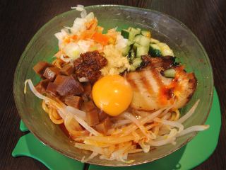 ほどなく出てきた油そばは、透明な容器に入っており、観るだけで涼しげな印象を与えてくれる。麺は極太ストレート麺。なかなか美味しい。具は、チャーシュー・きゅうり・メンマ・もやし・ネギなど。きゅうりやメンマは小さく角切りで大きさがそろえられている。ラー油がピリ辛で、生姜とニンニクも入れたから、ちょっと味がくどくなってしまった。生玉子だけのトッピングの方がいいかも知れない。(2008/7/13)