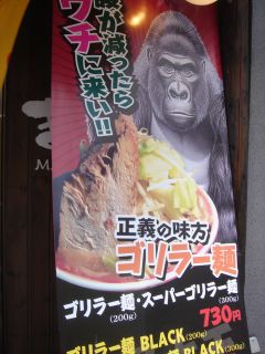 長野のしまんりょう小路にあるお店。「正義の味方 ゴリラー麺」の看板が特徴である。中華そばを注文する。「大盛りも同じ値段ですがどうしますか?」と聞かれたので「普通でお願いします」と答え、さらに「ライスかミニカレーも無料でセットできますが?」と聞かれたので「ミニカレーをお願いします」と答えた。