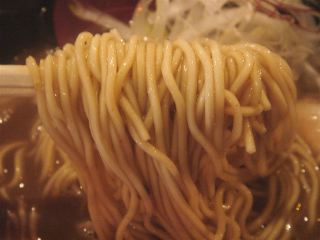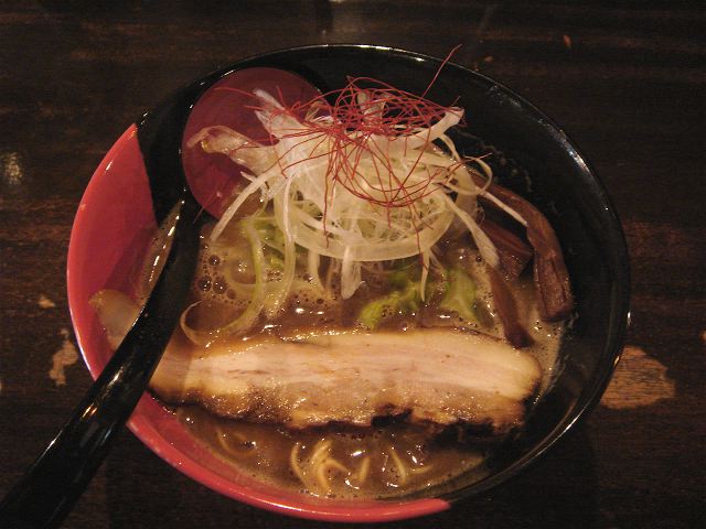 しばらくして、口径が小さく高さが高くて赤と黒を基調とした丼に入ったラーメンが出てきた。スープは濃厚な味噌味で、ドロドロとしてまるでポタージュのような感じである。麺は細縮れで柔らかめ。具は、チャーシュー・メンマ(太)・糸唐辛子・ネギ・キャベツ。個性的なラーメンである。接客もよくて気持ちがよいお店である。(2010/5)