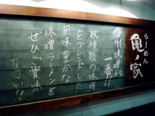「亀」と聞いたら来ないわけにはいかないでしょう(笑)。18時開店という情報だったので18時少し過ぎに行くとまだ開いていない。おかしいなと思いながら駅ビルの中の本屋さんで時間をつぶして19時に行ってみると見事に開店していた。メニューは、みそらーめん(信州味噌は一番)750、らーめん(昔ながらの中華そば)600、チャーシューめん900、SHIOらーめん800、タンめん(野菜たっぷり)850、みそチャーシューめん1,050、みそバターらーめん850など。みそらーめんを注文した。