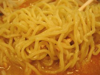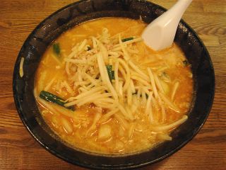 丼に茹でた麺を入れ、中華なべでスープともやし・タマネギ・ニラ・挽肉などを炒めてから麺の上にかける作り方。そのためにスープは熱々である。数種類の信州味噌をブレンドした味噌ダレに豚骨ダシの利いたスープは、深い味わいである。麺は中縮れでやや柔らかめに茹でてある。スープが熱々なのだから、もう少し麺はしっかりしていた方がいいなぁ。具は、もやし・タマネギ・ニラ・挽肉炒め。(2009/2/20)