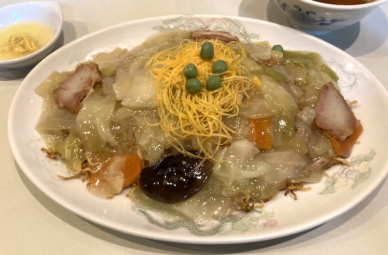 上田のB級グルメはあんかけやきそばらしい。老舗の日昌亭による。今日は18時30分までの営業とのこと。店内に10人ほどの待客が。ノートに名前を書いてしばし待つ。店内は暖かいので待つのもつらくない。メニューのやきそばと書いてあるのがあんかけやきそばのことだ。並を注文。麺は細くてしなやかなのは意外であった。味は、小皿にカラシと酢で好みのカラシ酢を作り、かけて味わう。個性的な食べ方である。お店を出る時には18時30分を超えていたので看板は消されていた。(2025/3)