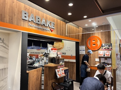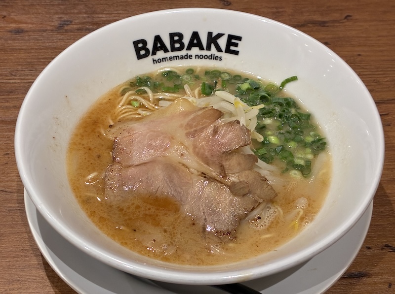 長崎駅に到着した。目の前のかもめ市場のBABAKEに入る。ババケで黒ラーメンのハーフを食べる。マー油と醤油ダレの入ったとんこつスープだが、なんつッ亭やぶたまるきに比べるとインパクト弱い。自家製麺は好印象。(2025/6)