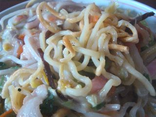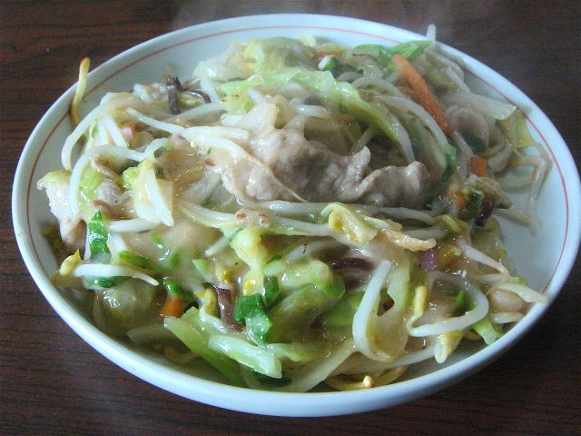 しばらくして出てきた皿うどんは、写真のような湯気がたっぷりと出ている熱々の逸品。麺は細揚げ麺ではなく、ちゃんぽん用の麺を焼き上げて焼き色をつけたものを使っている。トローリとした餡かけが香ばしい麺に絡んで新鮮な美味しさを感じる。もちろんテーブルにはウスターソースが置いてあるのでそれをかける。うーん、満足!(2010/11)