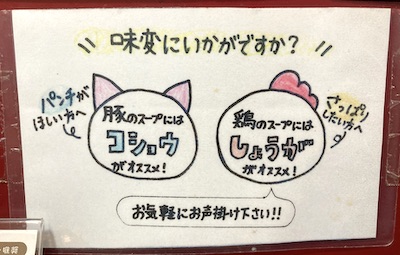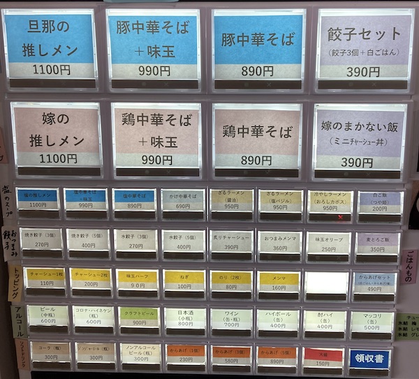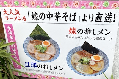「嫁の中華そば」というお店の後にできたお店らしい。「嫁の中華そば」は鶴崎駅の近くに移転したようだ。だから店名は「嫁のあと」になったのかな。メニューは、旦那の推しメン1100、豚中華そば+味玉990、豚中華そば890、嫁の推しメン1100、鶏中華そば+味玉990、鶏中華そば890など。券売機で、豚中華にするか鶏中華にするか悩んだが、結局豚中華そばを選択。出てきたラーメンは、スープはあっさり豚出汁で、麺は喜多方風の平太麺。豚骨だが白濁はしていない。具ではメンマが美味しい。(2024/6)