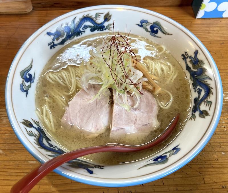 12時過ぎに伺うと店外に待ち客あり。先に大分駅のみどりの窓口で用事を済ませて、再度伺うとすぐに入れた。なかなか人気があるお店のようだ。メニューは、豚骨魚介醤油のらぁ麺、辛い辣醬麺、醤油の中華そば、塩の塩そばなどがあり、つけ麺もある。文字だけのメニューなので、どのように違うのかがわかりにくい。豚骨魚介醤油のらぁ麺を注文した。割と早く出てきたらぁ麺は、白濁した九州らしい豚骨スープの醤油味で、中細麺。これぞ九州のラーメンだ。(2024/6)