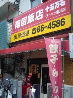 看板に「十五万石亀川店」と「南国飯店」と書いてある。出前OKのお店である。メニューは、ラーメン500、ミソラーメン550、しょうゆラーメン550、チャーシューメン700、ワンタンメン500、チャンポン650、皿うどん600、焼そば550、ギョーザ350、焼きめし550、カレー500、カツ丼650、玉子丼500、中華丼650など。メニューを見ると大衆中華料理店という感じだ。ラーメンを注文した。