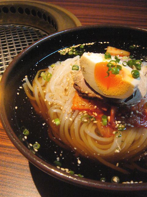 焼肉屋なのテーブルにはガスコンロがついている。出てきた冷麺は、これでもかというくらいに透明度の高いスープに麺や具が鮮やか。自家製の麺もツルツルとした喉ごしでとても美味。(2011/05)