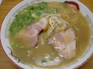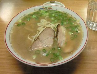 豚骨とカツオからとったスープは表面が白っぽいがその奥は茶色の醤油色。麺は、中やや縮れ麺で柔らかめ。具は、チャーシュー(2)・メンマ・もやし・ネギ。(2004/02/21)