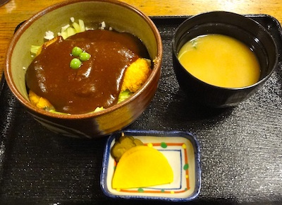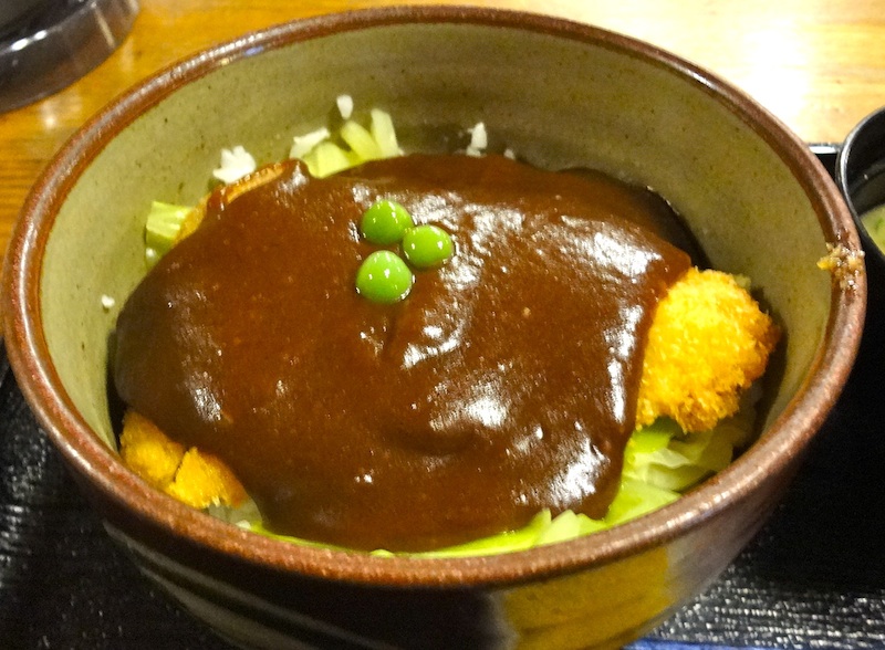 しばらくして出てきたカツ丼は、濃い色で粘度の高いドミグラスソースがかかっている。カツ自体はサクサクしており食べやすい。日本全国いろいろなカツ丼があるし、ドミグラスソースカツ丼もあるが、かなり個性的である。(2013/12)