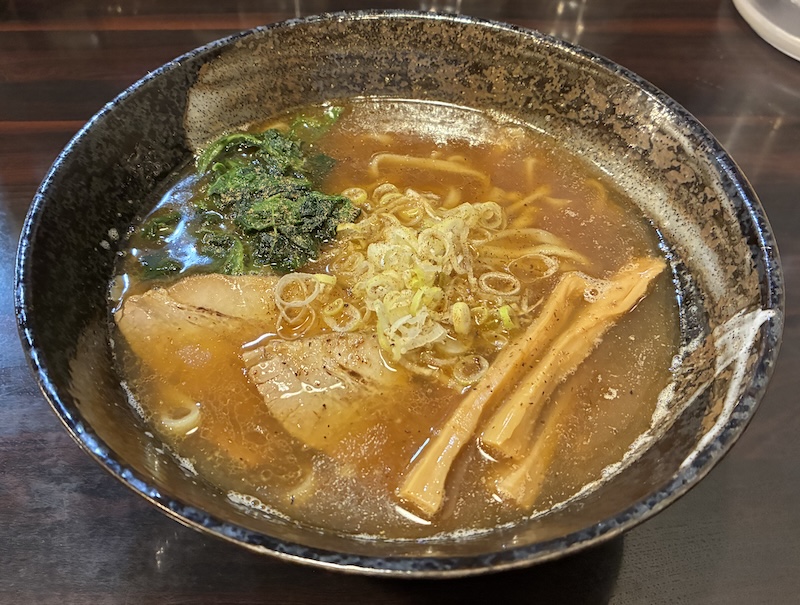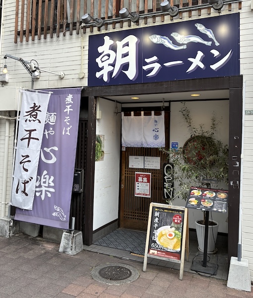 朝から営業しているお店。看板にも「朝ラーメン」と書いてある。メニューは朝煮干しそば650、煮干しそば850、濃厚煮干しそば950、中華そば850など。濃厚煮干しそばを注文。細麺か平打ち麺を選べるというので平打ち麺を選択。茶濁した煮干しスープに平打ち麺が合う。チャーシュー2、めんま、ほうれん草など。途中から煮干酢で味変したがこれがグッド!(2025/5)