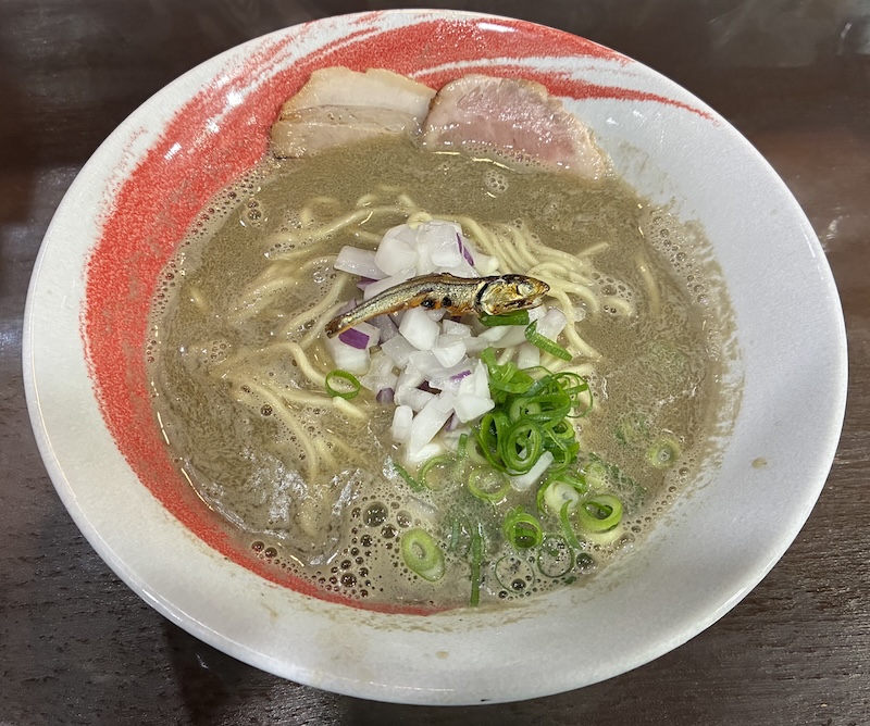 朝ラーメンのお店。お店に入る前から煮干しの香りが漂っている。食券を買いカウンター席に座る。出てきたラーメンはニボシがちょこんと乗っているのがアクセント。スープはいわゆるセメント系で1mmの先も見えないほどの濁りである。チャーシュー2、タマネギ、青ネギ。途中から酢で味変してさらに美味しくなった。(2025/5)