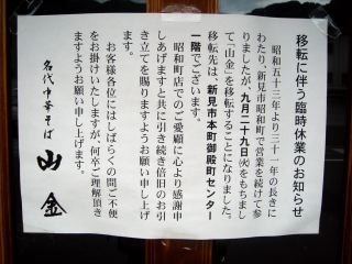 新見駅に着いた。昼食の時間である。昭和22年創業の山金へ向かうが、なんと張り紙がしてある。残念ながら場所を移転したというのだ。地図が示してないので移転した場所がわからない。そこで二番手候補のまるしげへ向かっ た。国道180号線沿いにあるこのお店は、店の入口が面した細い通路の裏側に駐車場がある。そのため「注意 人が出ます! 駐車場は奥に有ります」などと書いてある。店内に入るとご主人とその母親と思われる老女がいる。しばらくするとご主人の奥様と思われる方が岡持ちを持って帰ってきた。出前もやっているようである。メニューは、ラーメン550、ラーメン(中)600、ラーメン(大)650、ラーメン+焼めし(小)750、ラーメン+焼めし(中)850、ラーメン+焼めし(大)950、ギョーザラーメン650、チャーシューメン750、ギョーザ250、ラーメンライス650など。店内にはラーメン一杯あたりの栄養成分が貼ってある。それによると、エネルギー440kcal、たんぱく質20g、脂質5g、炭水化物75g、塩分7gとなっている。