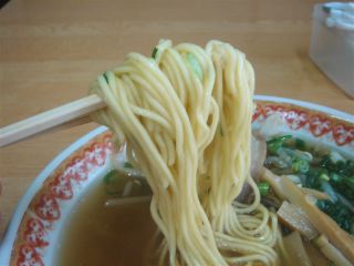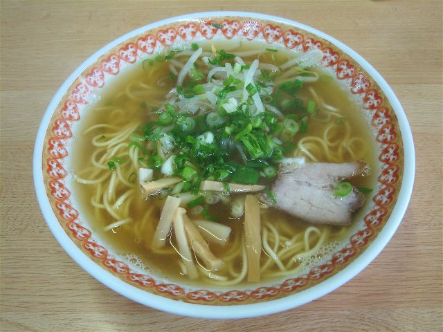 空いているので小上がりに座り、ラーメンを注文する。たちまち出てきたラーメンは、スープは薄めの茶色で、豚骨・鶏ガラなどのダシと思われる。あっさりとした醤油味である。麺は、中ストレート。具は、チャーシュー(2)・メンマ・もやし・紅縁取りカマボコ・ネギ。カマボコは奥に隠れていたので写真には写っていない。全体的に岡山のラーメンに近い感じだ。(2009/10/10)