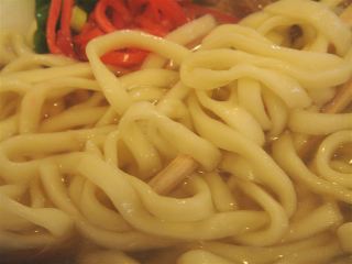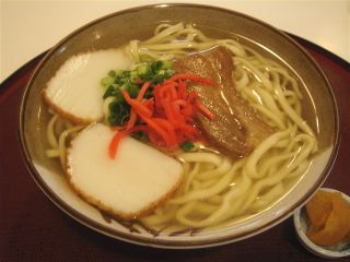 出てきた沖縄そばは、麺は平打ちのストレートで柔らかめ。スープはあっさり したカツオ中心のもの。具は、三枚肉・カマボコ・紅ショウガ。暑い日にも食べられるように、あっさりとしているのだろう。(2008/5/25)