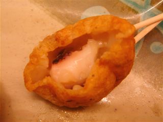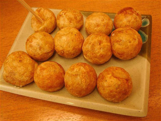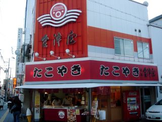 昭和10年(1935年)創業のたこ焼きの元祖。店名も「たこやきの元祖 本家 会津屋」と“元祖”と“本家”が二つも付くという完璧さである。うんちくはお店のホームページに任せるとして、さすが大阪の若いカップルはデートでちょこっとこういう場所へ寄るんだな。オヤツ感覚なんだろうか。元祖たこ焼きを注文すると、作り置きなのかタダチニ出てきた。でも温かい。ウスターソースを皿の端に少したらしてたこ焼きを食べてみた。なるほど、こんな味なんやな〜〜、と思っていると「何も付けずにお召し上がりください」という文字が飛び込んできた。そうか、何も付けないのか。四つ目からは、何も付けずに食べた。ダシの味で食べられるんや。これが本物のたこ焼きなんだ!(2010/01)