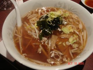 斜め向いのレストランは空っぽなのに、このお店は流行っているのか行列に並んで食べた。うなぎの寝床のような店内も活気がある。しょうゆラーメンはあっさりしていたがダシが利いていた。餃子も美味しい。餃子が旨いとラーメンも美味しい法則があるような気がする。(2005.10.10)