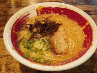 テーブルで相席になってしまった。まず出てきたお水は小さな陶器に入っていた。さすがは、有田や伊万里を抱える佐賀県だけのことはある。それとともに小さな容器に炭入り氷水が出てきた。水にこだわっているなぁと好印象である。さて出てきたスープはコクのある豚骨スープ。予想以上に美味しい。麺は細ストレートで旨い。具は、チャーシュー(2)・キクラゲ・ネギ。美味しいので思わずスープを完食してしまったら、丼の底から“感謝”の文字が表れてきた。粋な演出である。
