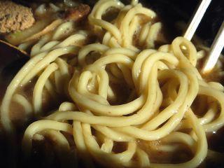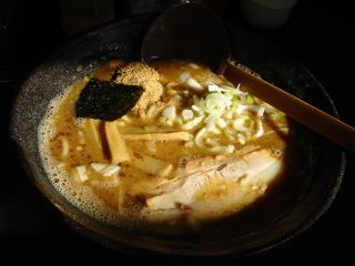 席に案内されしばらくしてらーめんが出てきた。魚粉がスープの上に浮いている。スープ自体は、トロミがあり濃厚な魚ダシ。もちろん豚骨も利いておりバランスがよい。麺は太ストレートでコシがありモチモチしている。具は、チャーシュー(バラ)・メンマ・のり・長ねぎ・タマネギ。長ねぎだけでなく刻みタマネギもトッピングされているのでシャキシャキと歯ごたえがよい。(2008/11/21)