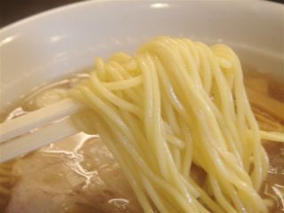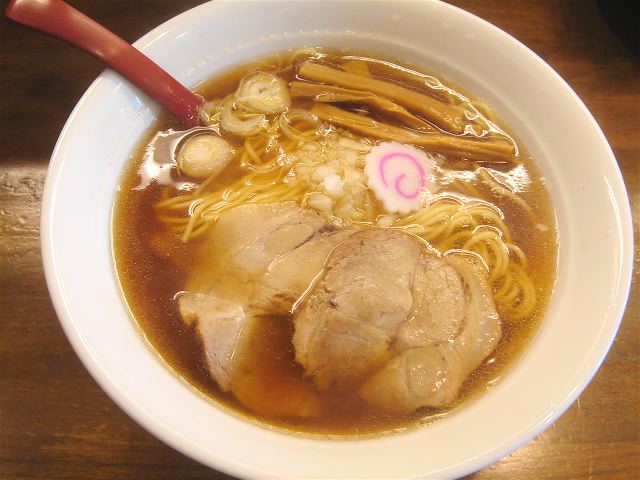 カウンターに座り、中華そばの到着を待つ。出てきた中華そばは、スープは煮干の風味がきいたあっさりした醤油味。薄めの味付けになっている。麺は中ストレート。チャーシューはフライパンで温めてから乗せている。タマネギの微塵切りも乗っている。(2011/10)