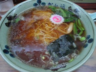 中華そばのスープは、鶏・豚骨・魚のバランスよくややあっさり目の醤油味。麺は、細縮れ麺でスープがよく絡んで喉の奥へと入っていく。具は、チャーシュー(厚・硬)・メンマ・ほうれん草・なると・のり・ネギ。(2004/11/6)