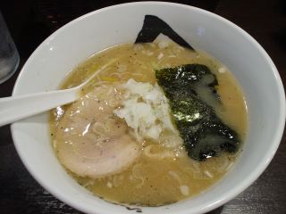 白濁したスープは豚骨+煮干であるが油が多めでコッテリしている。麺は、中ほぼストレート。具は、チャーシュー・メンマ・ネギ・のり・タマネギ微塵切り・ゆず。メンマはコリコリとした食感。タマネギ微塵切りは八王子方面で入れるらしいが浦和でも入れるのか? カウンターにはいろいろな薬味がそろっている。途中からユズ入り唐辛子を投入して味を変えて食べてみた。