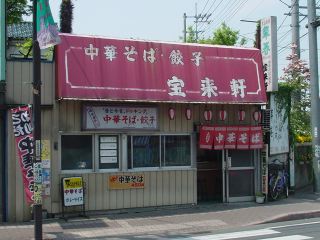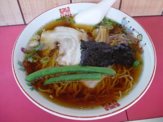 川越で午前中を過ごし、腹ごしらえによった駅前食堂。こじんまりした店には、常連客らしきオジサン2人が、餃子などをつまみながらビールや日本酒を飲んでいる。ご一緒したい気持ちがあったが、午後から出かけなければいけないので自粛。たちまち出てきた中華そばは、スープは醤油味。麺は中華麺で柔らかめ。具は、チャーシュー・メンマ・のり・なると・いんげん・ネギ。(2005.4.29)