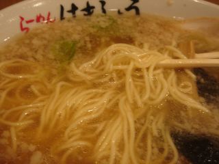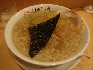 スープは、丸鶏をベースにしたもの。細かな背脂が表面に浮いている。スープは、ゆずの香りがあるものの、しょっぱく感じる。昔、伊勢原にあった“のぶ”というお店の味に似ている。ということは“にんにくや”系? 麺は、細ストレートでなめらかな食感。具は、チャーシュー・メンマ・のり・ネギ。(2006.05.22)
