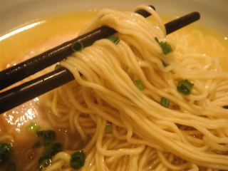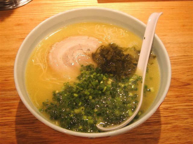 あっと言う間に出てきたラーメンは、白濁したスープから漂う鶏の香りが食欲をそそる。飲んでみるとさらに鶏の旨味が口に広がる。麺は細ストレートで博多ラーメンの麺に近く、シャキシャキしており美味しい。具は、チャーシュー(巻バラ)・アオサ・ネギとシンプル。(2009/10/25)