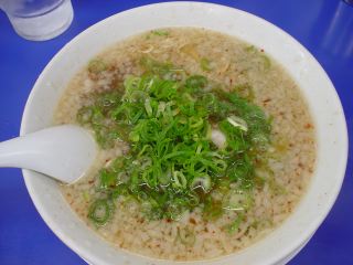 スープは一面背脂でまっ白。ダシ自体はあっさりしているようだが、脂でコッテリ感を十二分に出しておりインパクトがある。一味の量も丁度よい加減である。麺は細ストレート麺で食感がよい。具は、チャーシュー(薄・多)・メンマ・九条ネギ。メンマは不要かな? 九条ネギは甘味があって美味しい。会計を終えたら「おおきに!」だった。
