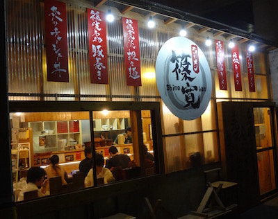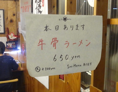 店頭に「本日あります 牛骨ラーメン 650yen」のチラシを見て、これにしようと決めてから店内へ入った。店員さんに牛骨ラーメンを注文してからしばし待つ。かなりのお客さんの入りに人気があるお店なんだと認識する。牛骨ラーメンのスープはあっさりしている。縮れ麺によく絡んでちょうどいい塩梅だ。トッピングののりには「篠寛」の文字が入っている。美味しいラーメンを食べて今回の旅の最初の宿となるビジネスホテルに向かった。(2015/9)