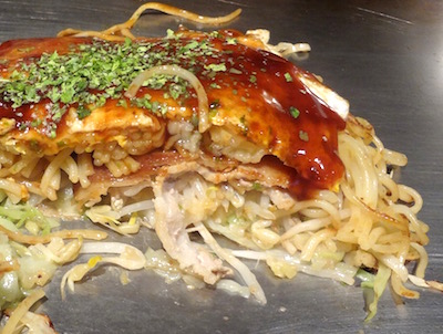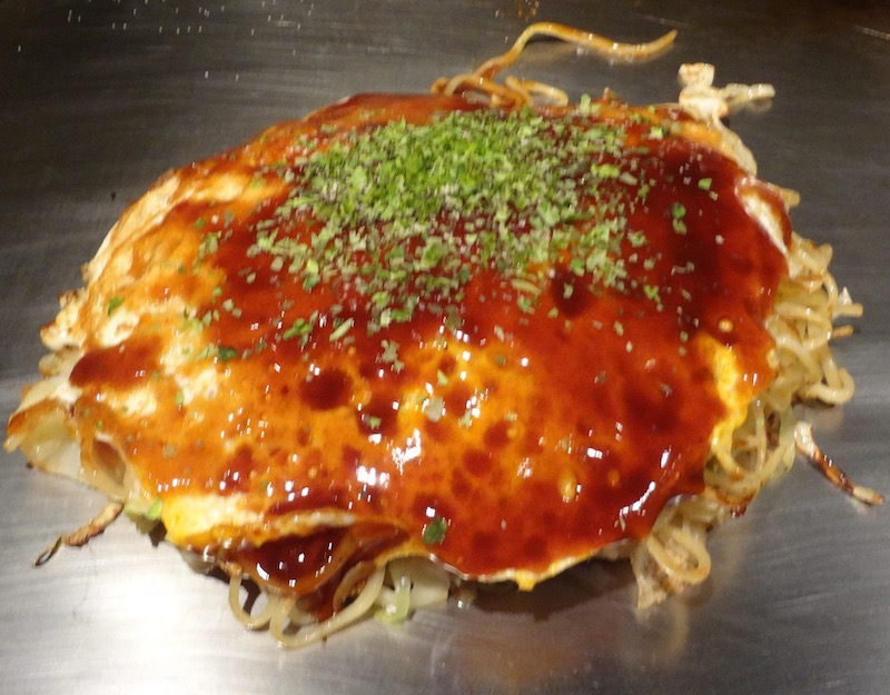 石見川本駅で下車すると、地元の人々が歓迎してくれ、飲食店マップを配布してくれた。お好み焼きを食べよう! と徒歩5分のここ「かんちゃん」へ。お店のカウンターに座り、肉玉そばの広島風お好み焼きを注文した。ここは島根県だけどね。定番のそば入りを美味しくいただいた。(2017/10)